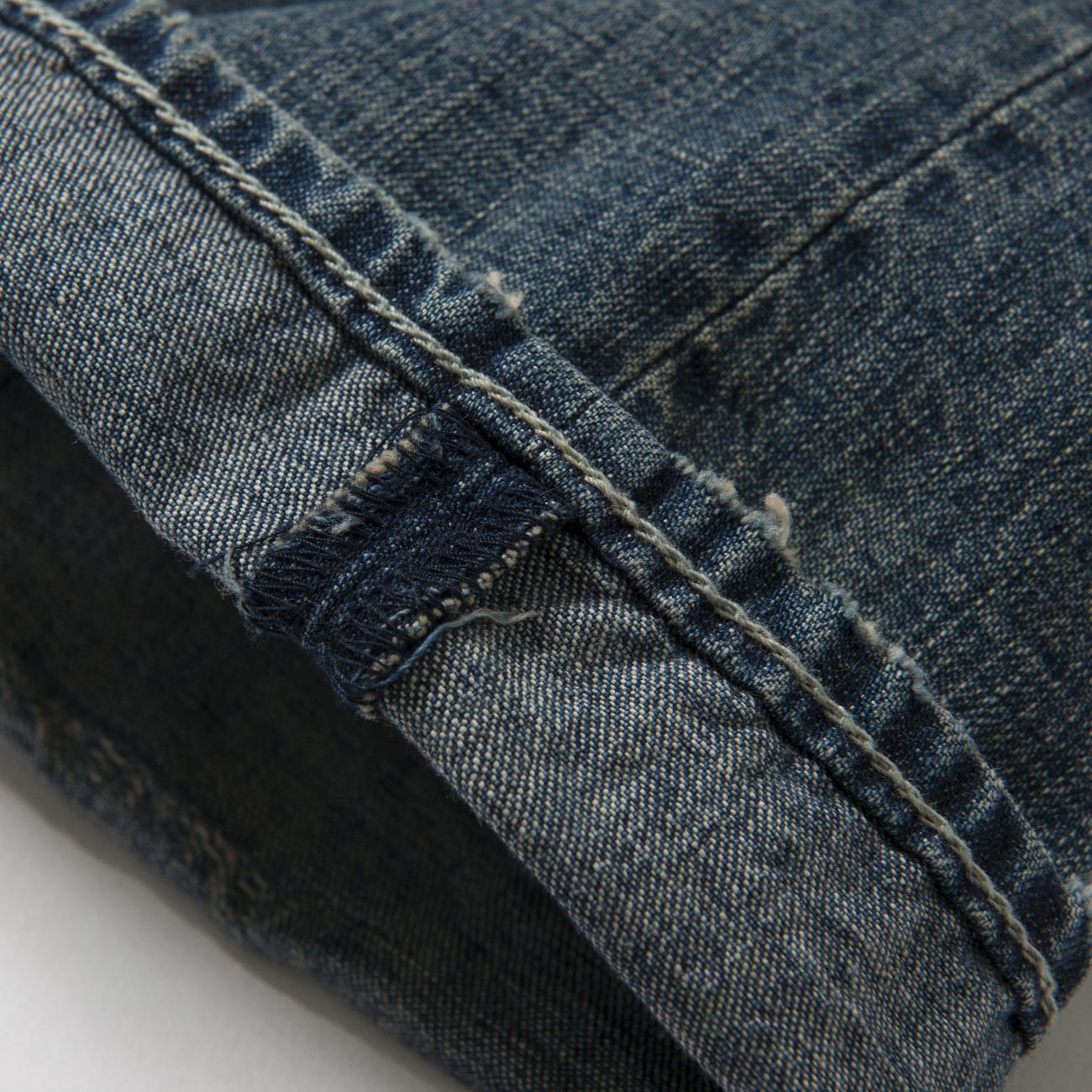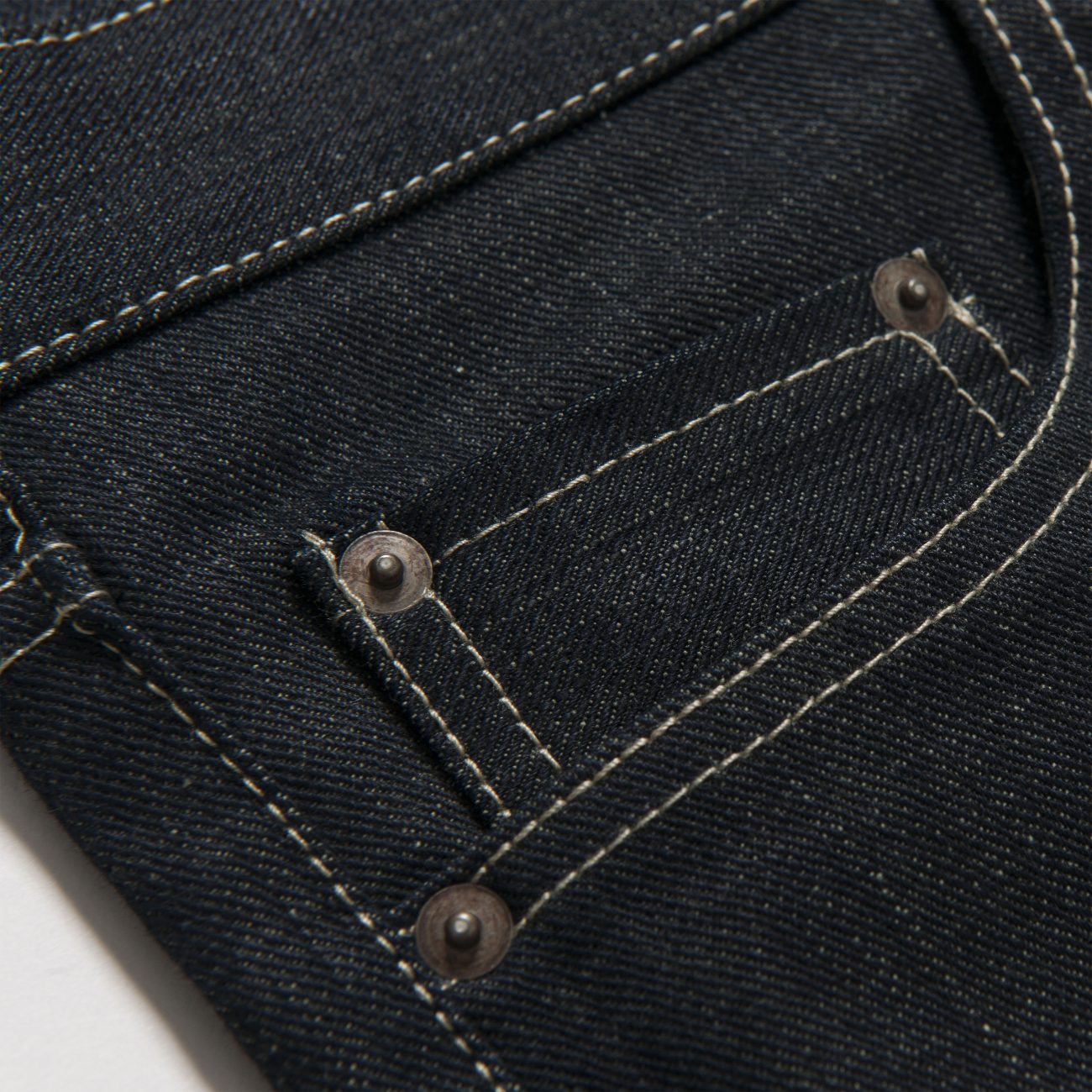 オリジナルのデニムボタンや縫製技術の高い「巻き縫い」による細部のチェーンステッチ等、ディティールワークに拘ったミッドストレートデニム。 -