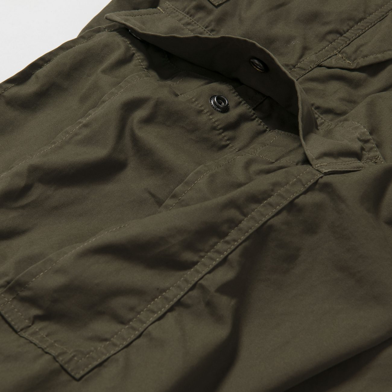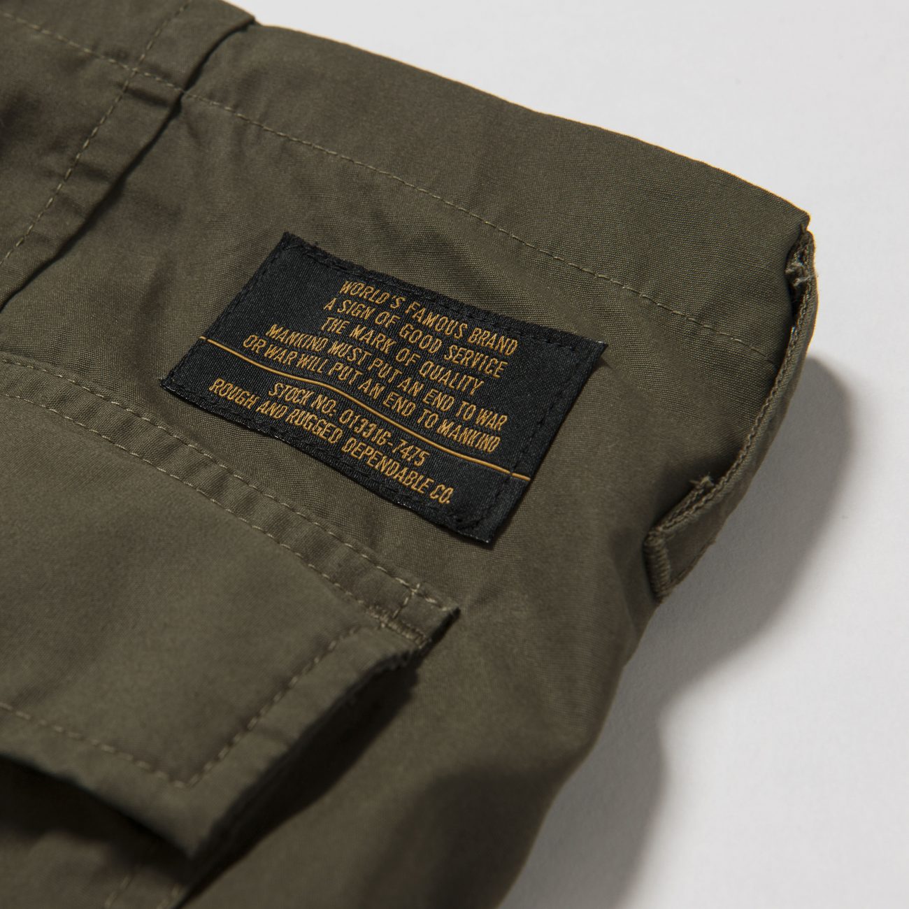サイドとバックの大きめのポケットと腰回りのヘリンボンテープがミリタリーテイストを演出。