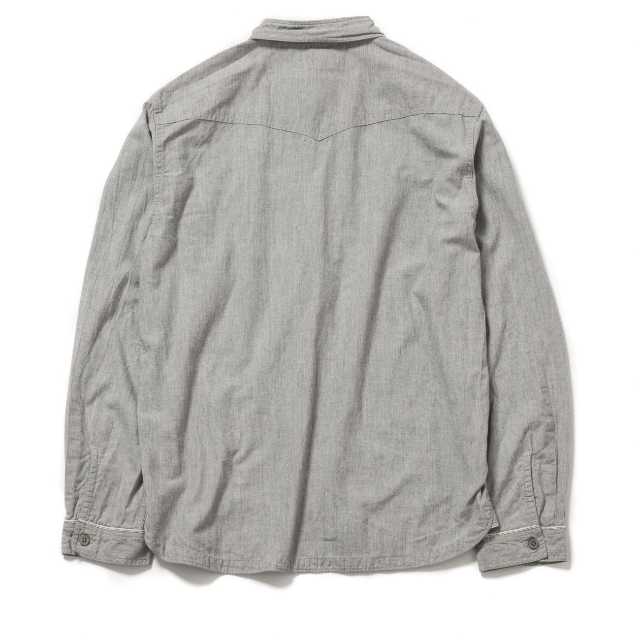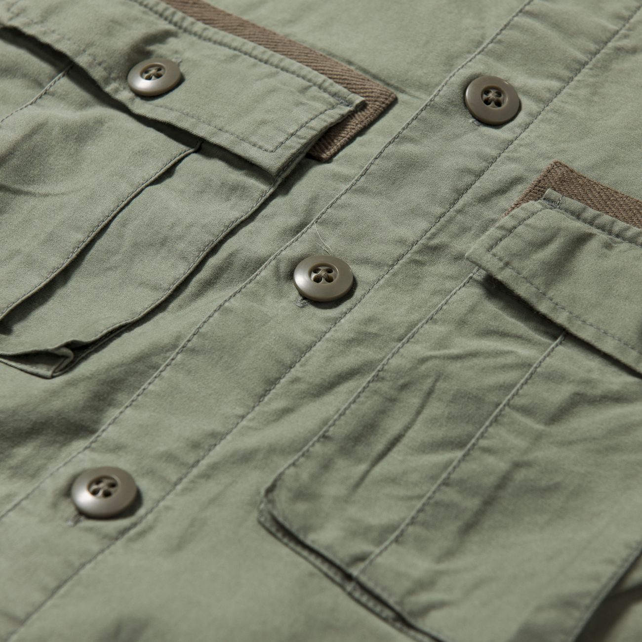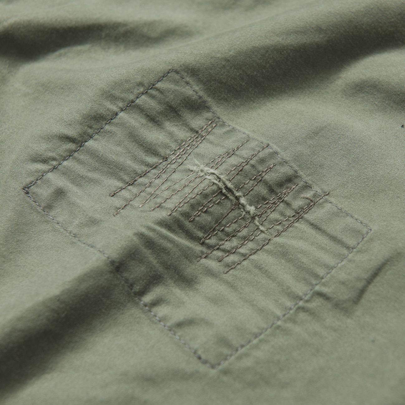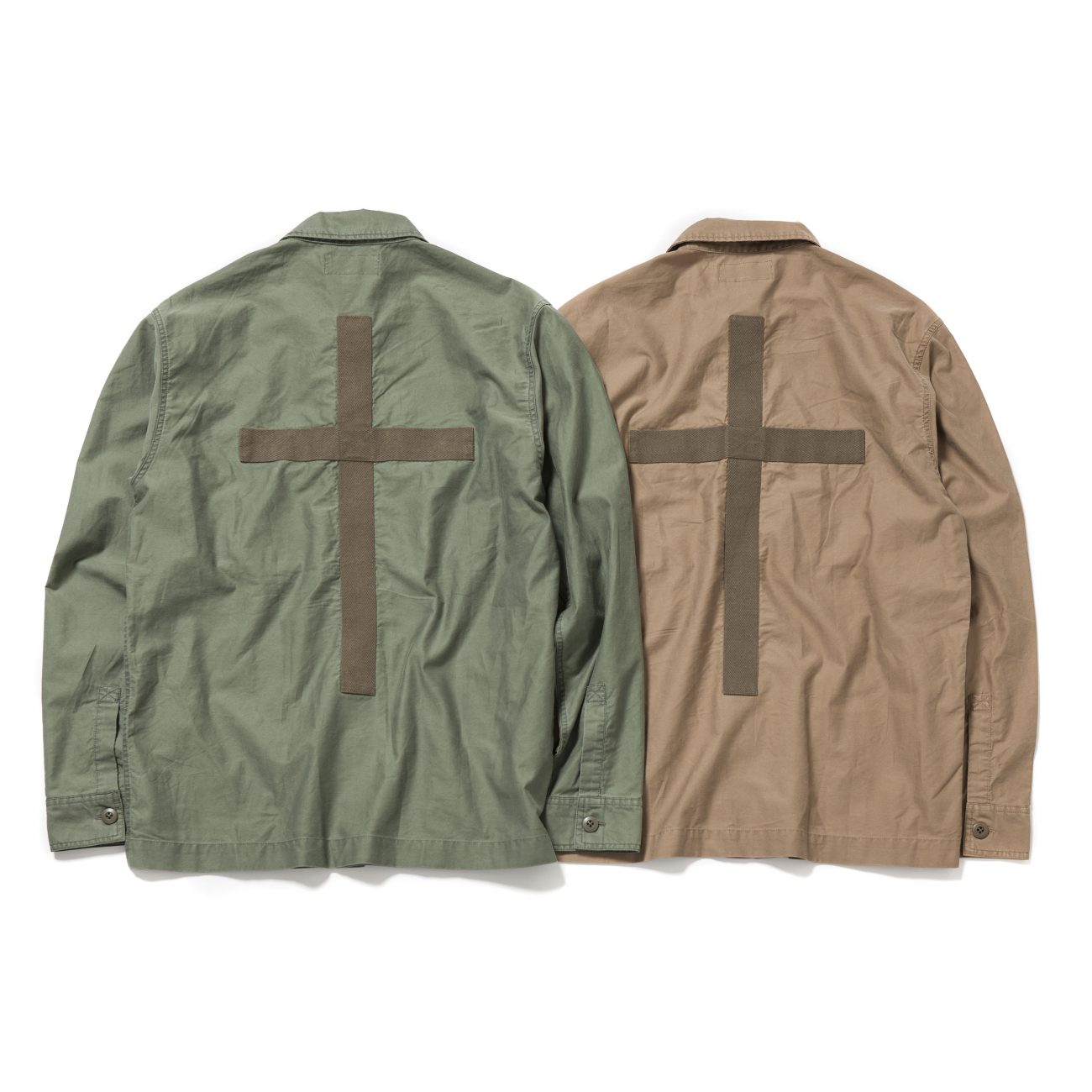 両胸ポケットの当て布の補強やリペア加工などミリタリーテイストを踏んだんに配置しバックのテープによるクロスが特徴的なシャツです。 -
