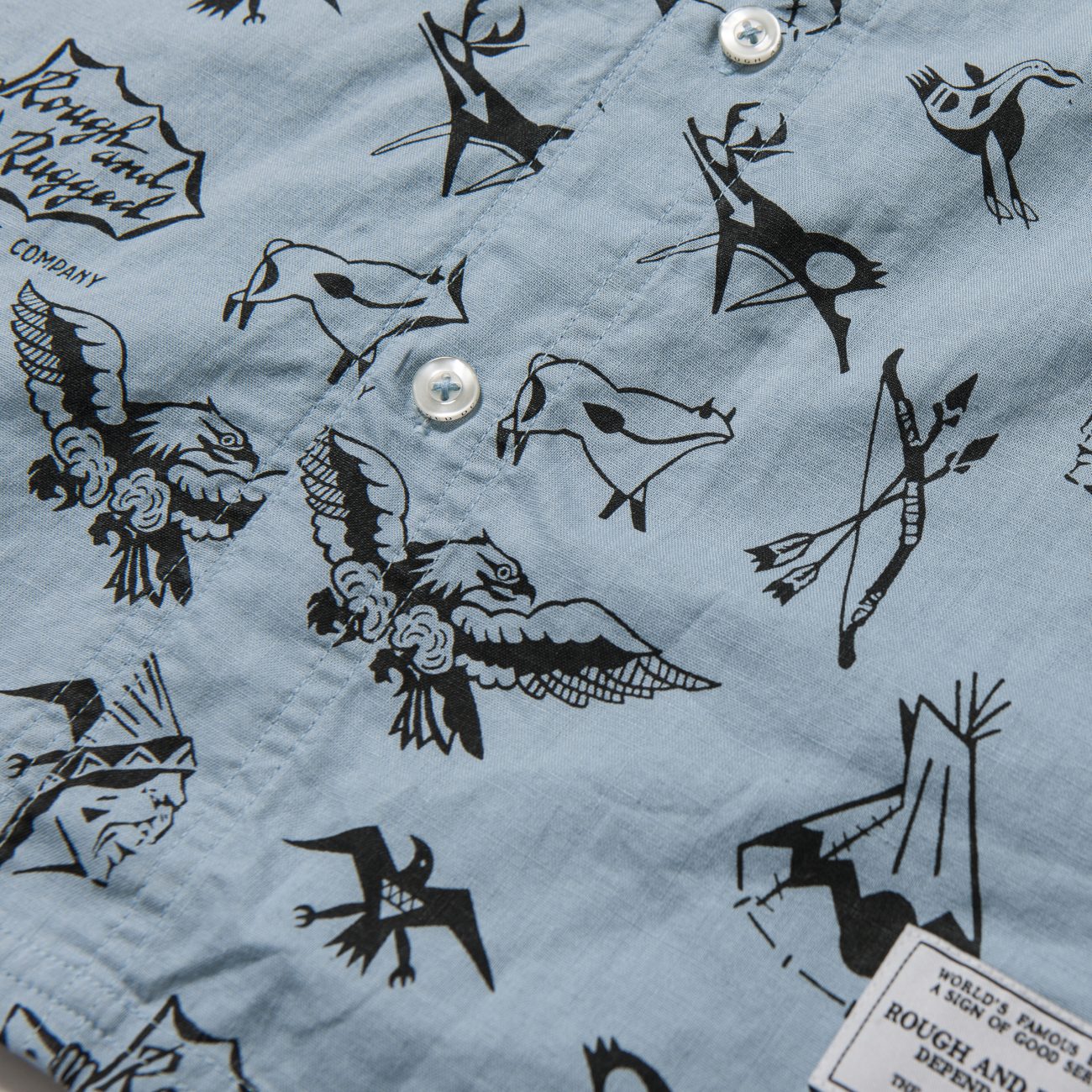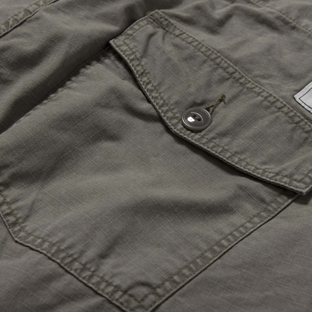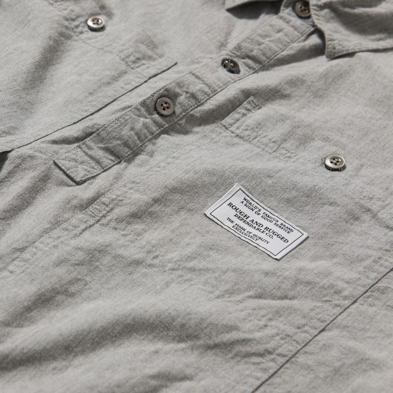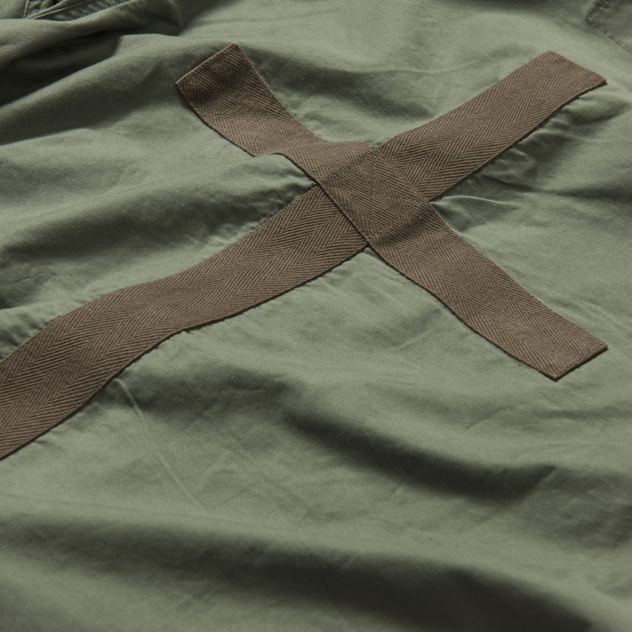 両胸ポケットの当て布の補強やリペア加工などミリタリーテイストを踏んだんに配置しバックのテープによるクロスが特徴的なシャツです。 -