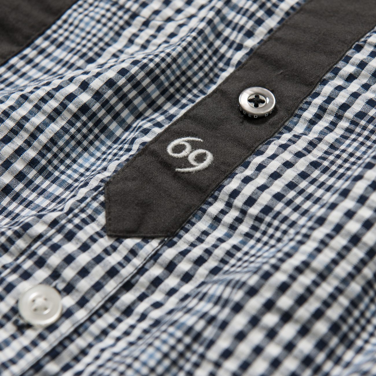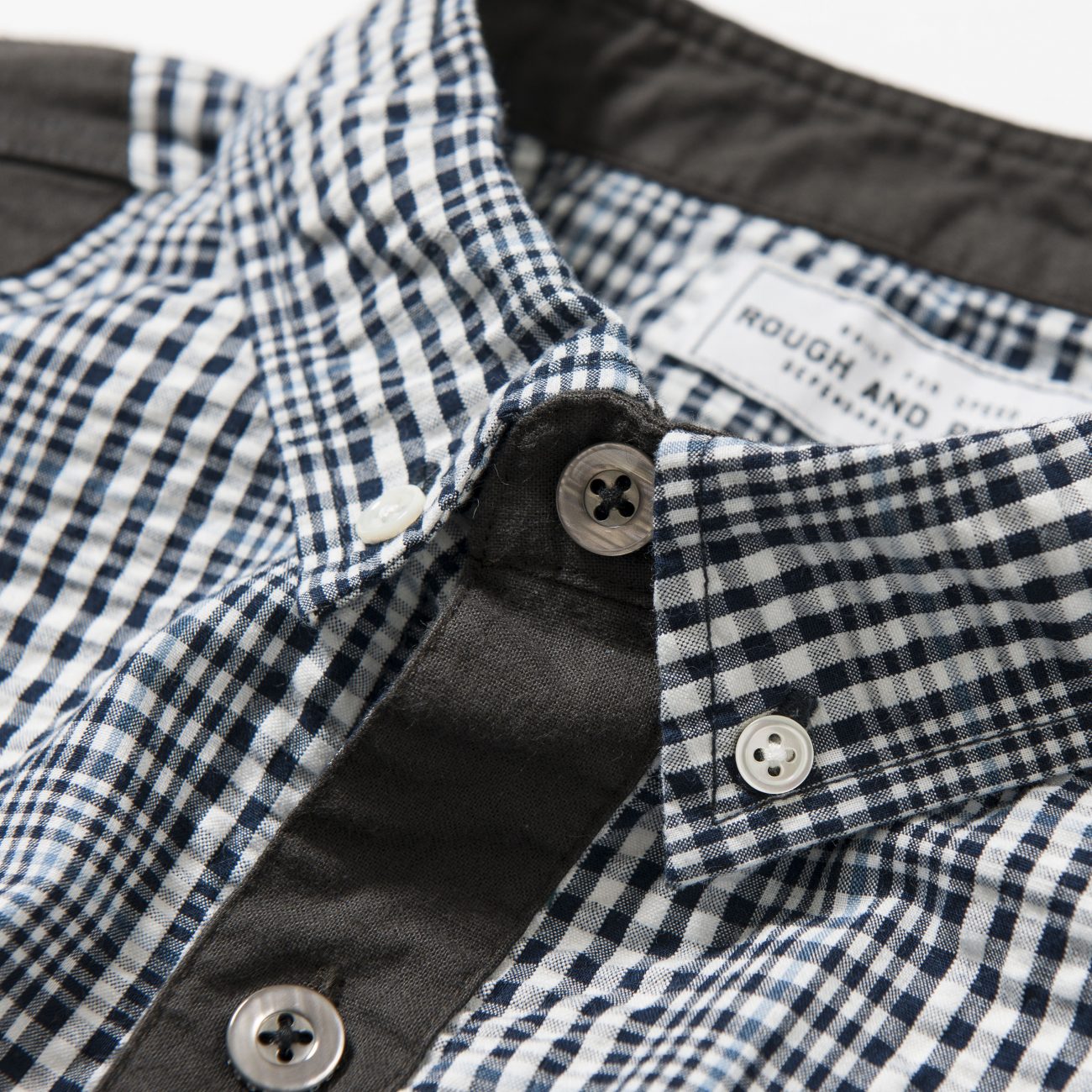 全体的に技術力の高い「巻き縫い」で縫製し、長袖シャツを作成後カットオフし7分丈にしたMOCK。