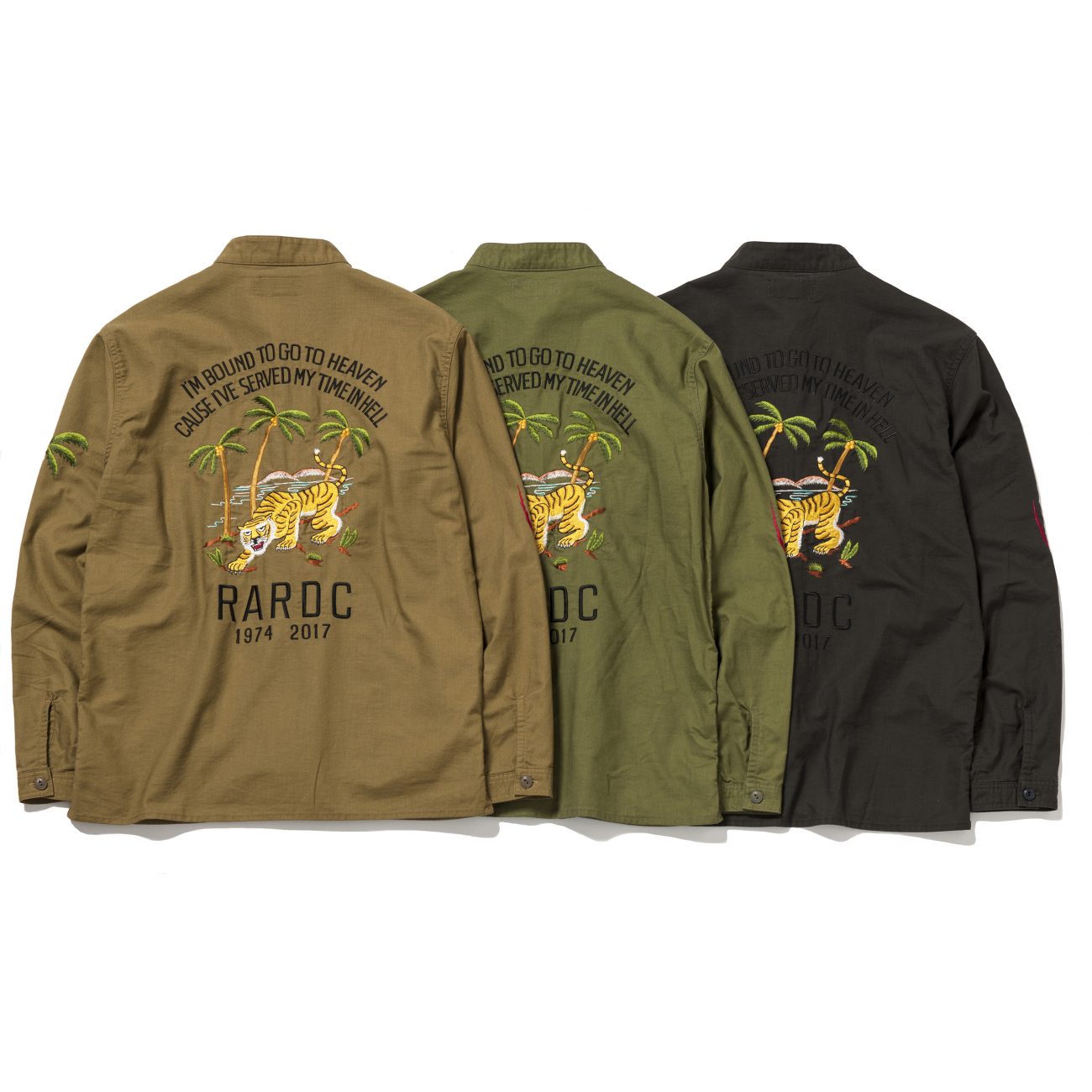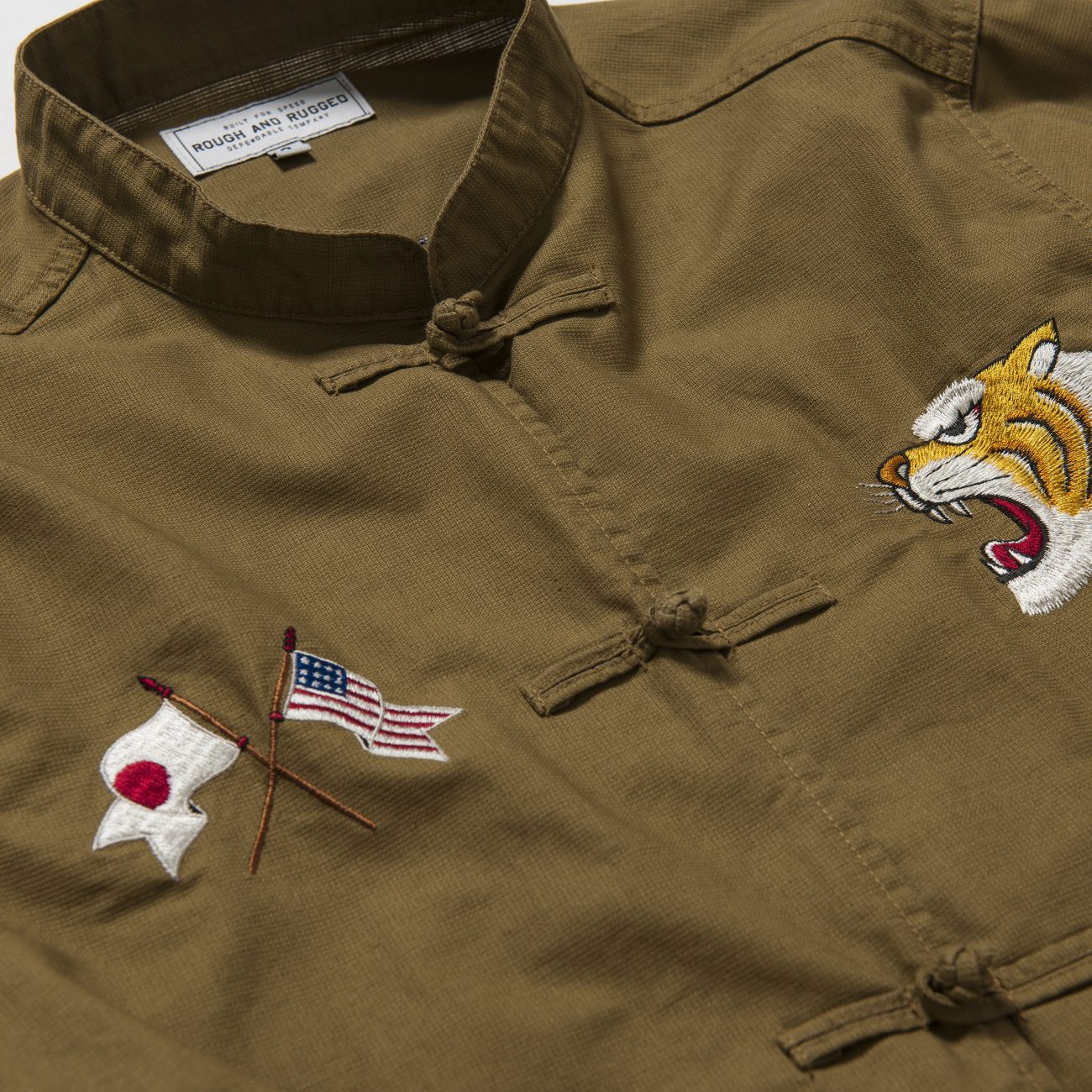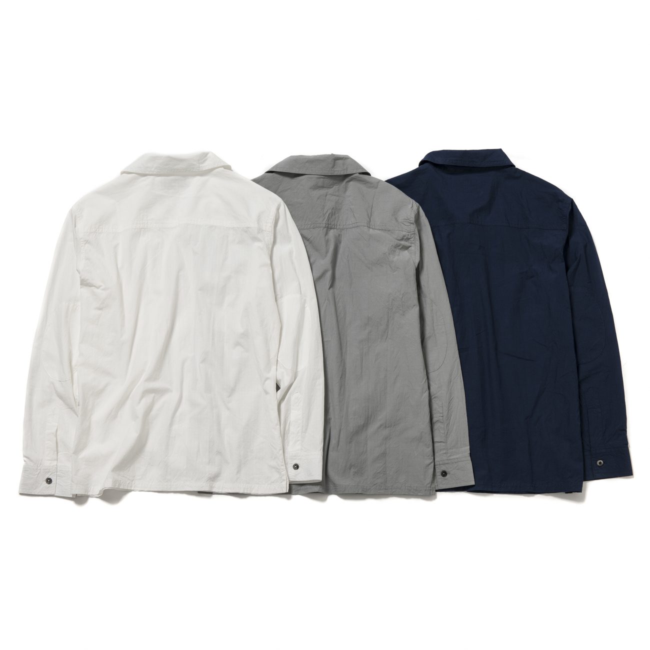 AUTHENTICなチャイナシャツを原型に、主要なディティールを踏襲しつつもサイドポケットを配置するなど、JKTに歩み寄る機能性を持たせる。